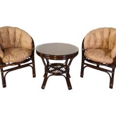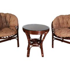 Комплект из натурального ротанга, состоящий из двух кресел и круглого столика с плетеной столешницей. Стекло входит в комплект.