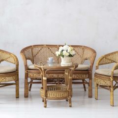 Комплект мебели Пеланги 02/15 включает в себя: 2 кресла и столик с красивым плетением снизу и полочкой, съемные подушки из материала улучшенного качества.