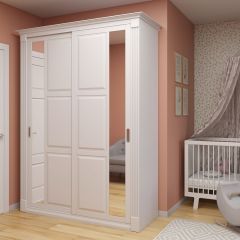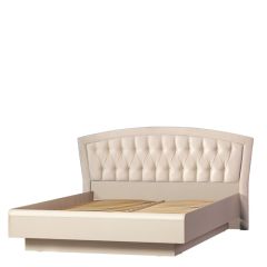 «кремовый белый», который уже успел полюбиться клиентам фабрики по серии «Марлен», но отличается более современным дизайном. В нем отсутствуют замысловатые декоративные элементы и колонны, на первый план выходят прямые линии. Украшением комплекта служат оригинальные итальянские ручки золотистого цвета. В оформлении фасадов комода сделан необычный ход. Некоторые линии, делящие ящики на, казалось бы, самостоятельные отсеки, на самом деле являются фрезеровкой. Кровать оснащена мягким тканевым изголовьем, что является сейчас безусловным трендом.